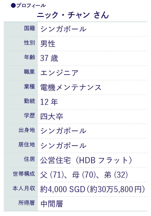 シンガポールの地場大手電機メンテナンス会社社員のチャンさん。シンガポール生まれ、シンガポール育ちの現在未婚の30代男性で、市内の公営住宅(HDBフラット)で70代の父母、弟と4人で生活している。