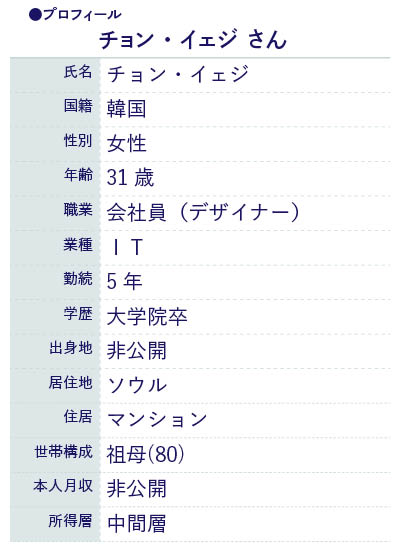 韓国のIT企業大手、NHNに勤めるチョン・イェジさん。社員デザイナーとして5年間勤務する。ソウル市内のマンション住まいだが、両親が郊外に転居したため、現在は80歳になる祖母と一緒に生活している。