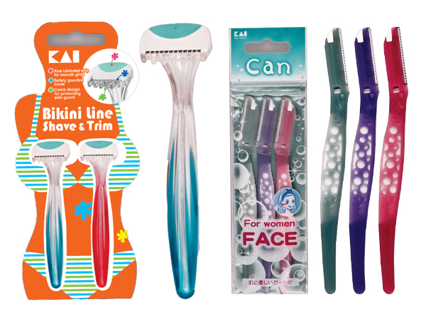 KAIショップで売れ筋のL字カミソリ(右)とビキニライン用カミソリ(左)(同)