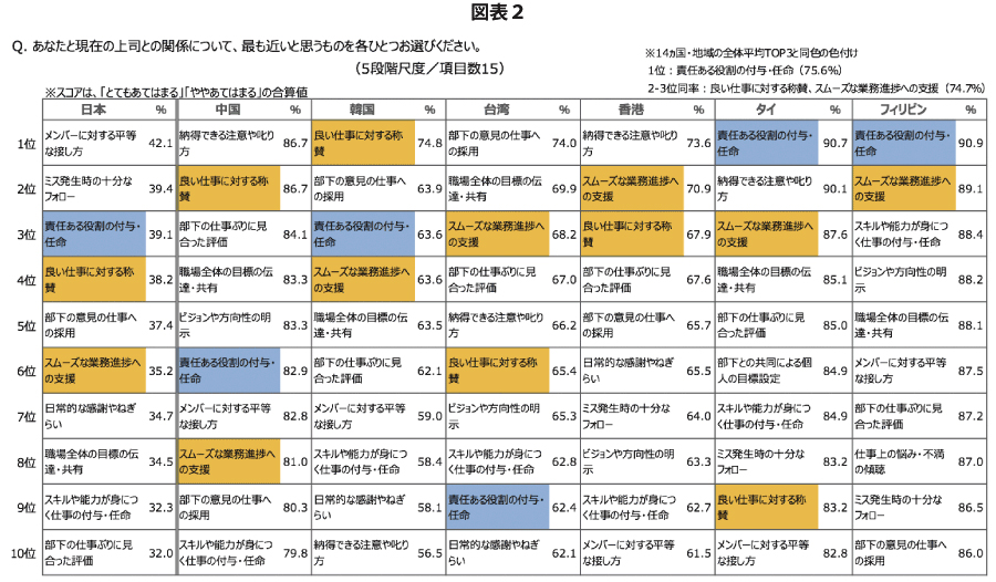 åŸæ¥å¡ã«å¯ŸããŠãäžåžãšã®é¢ä¿ã«ã€ããŠãæãè¿ããšæããã®ããèãããšããïŒå³è¡šïŒãïŒåç §ïŒãæ±ã¢ãžã¢ã§ã¯ãçŽåŸã§ããæ³šæãå±ãæ¹ããè¯ãä»äºã«å¯Ÿããç§°è³ããªã©ããå±ãããè€ããããšãã£ãæ¥ãæ¹ããè€ããããšå ±ã«ãæè¬ãããããã®èšèããããããããã10ã«å ¥ã£ãã®ãç¹åŸŽçã§ããä»äºã¶ããè€ããã ãã§ãªããèªãæè¬ã®æ°æã¡ãèšèã§äŒããéšäžã®ã¢ãããŒã·ã§ã³ãåäžããããªãŒããŒãæ±ããããŠããããã§ããããã¯æšä»ã®ãªã¢ãŒãã¯ãŒã¯ã§ãå®è·µã§ããå 容ã ãšæããŸãã