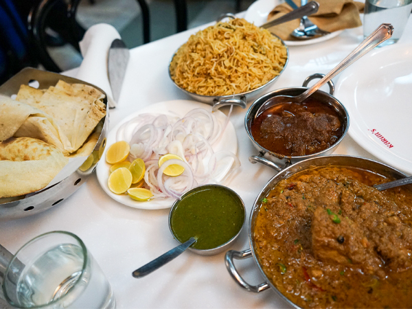 そこで出されるゴロリと肉塊の入った炊き込み米料理ビリヤーニ、ローガンと呼ばれる赤い油の浮いた濃厚なマトン・コールマー、アーモンドとヨーグルトをベースにしたリッチな味わいのバーダーム・パサンダ、それらと共に食べる布のように薄く焼いたルマーリー・ローティーと呼ばれるパン類が、ことのほかおいしく評判です。コロナ前は内外からの観光客などで満席となり入店待ちする客の姿も見られました。