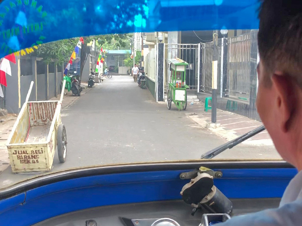 私たちはジャカルタ市内の最寄り駅で電車を降り、徒歩15分ほどの場所にあるステーションへインドネシアの伝統的乗り物バジャイ(三輪車)で向かった。住宅街の奥深くを走っていくと、黄色いバイクが住宅の前に停車されているのが見えた。