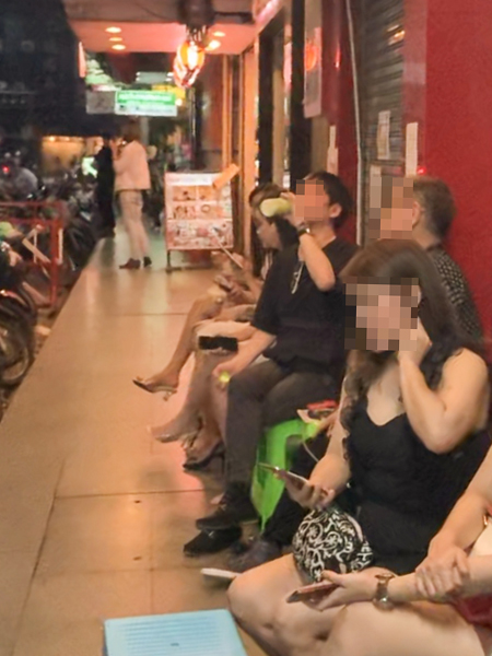 歓楽街の通り脇で客を待つ風俗店従業員ら=同