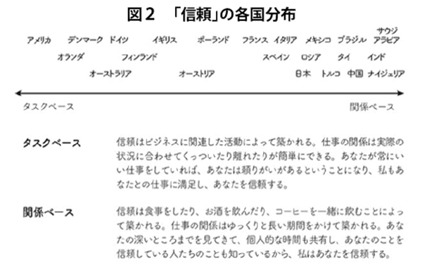 åèã®ãä¿¡é Œãã®ææšã«ãããŠãã¢ãžã¢åã«ãããæ¥æ¬ã¯ãä»äºãã§ãããã§ããªããããšãã芳ç¹ã§ä¿¡é Œãç²åŸããŠããã¿ã¹ã¯ããŒã¹ã®æåã«å¯ã£ãŠããŸããããã«æ¯ã¹ããšãäžåœã§ã¯æèŠªäŒãç€Ÿå¡æ è¡ãªã©ã瀟å¡å士ã®å®¶æçãªé¢ä¿æ§ã§ä¿¡é ŒæãéžæãããŠãããŸãïŒå³ïŒïŒã