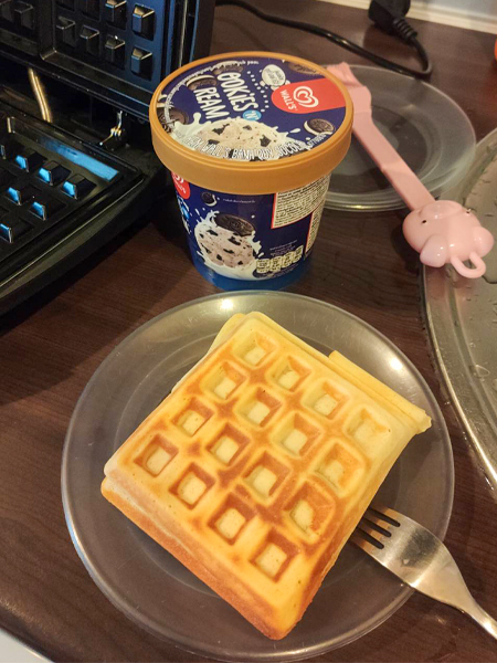 勤務中に食べるおやつ。手作りワッフルとチョコチップバニラのアイスクリーム(同)
