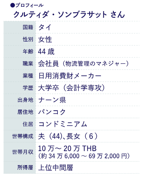 6歳の愛娘を育てるワーキングママのクルティダ・ソンブラサットさん(以下、愛称クンさん)。タイ北部のナーン県出身で、チェンマイの名門私立校、プリンスロイヤルカレッジの高等部を卒業後、国立チェンマイ大学で会計学を専攻。現在は首都バンコクに暮らし、ペット用品を扱う米国系の大手メーカーに勤務。物流部門のマネジャーとして手腕を振るっている。
