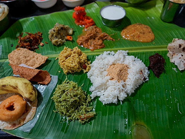 南インドのケララ州で行われたオーナムという祭礼での食事。バナナの葉に十数種類のおかずが盛られる