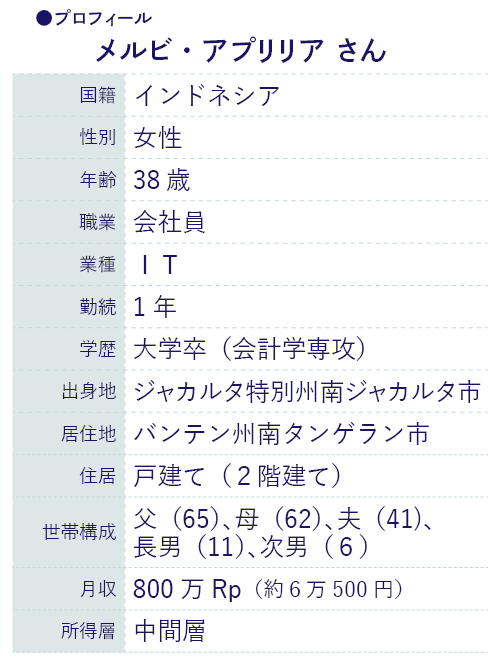 リース関連の企業で13年働いた後、現在のIT企業に転職したメルビ・アプリリアさん。首都ジャカルタからほど近いバンテン州南タンゲラン市で、夫、11歳と6歳の男の子、定年退職した両親と共に暮らしている。