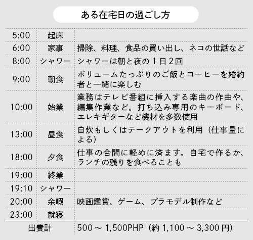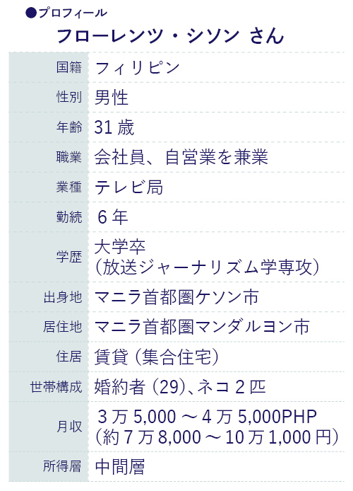 昨年3月、新型コロナウイルスの初の市中感染を受け、非常事態宣言が出たフィリピン。政府はマニラ首都圏を含む各地で不要不急の外出を制限した。フローレンツさんがサウンドエンジニアとして勤務するローカルテレビ局でも、この際に在宅勤務が導入された。