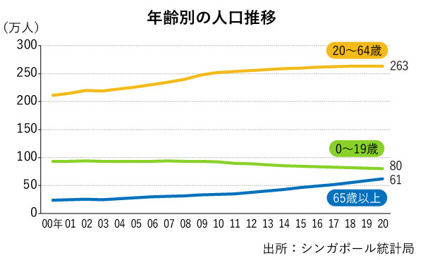 65歳以上の高齢者人口は61万4,400人。シンガポール人と永住権(PR)保持者全体の15%を占める(20年6月末時点)。世界銀行の19年統計によると、世界1位の日本には及ばないが、アジアでは香港、韓国に次ぎ、同じ東南アジアのタイと並ぶ高い水準だ。