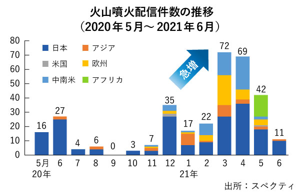 連載1回目のテーマは「火山の噴火」です。飛行機の運航に大きな影響を与え、溶岩流が人の住むエリアに迫ることもある自然災害の一つです。スペクティでは、世界中の火山噴火のSNS投稿についても収集・配信を行っていますが、2021年の3月、4月に配信数が急増していることに気がつきました。