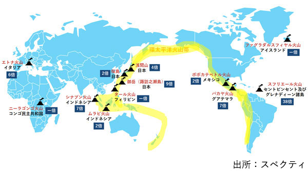 アジアを見ると2~9倍に増加しました。「環太平洋火山帯」の火山活動が活発化し、それが日本からインドネシアに至るエリアでも噴火という形で現れたということができます。
