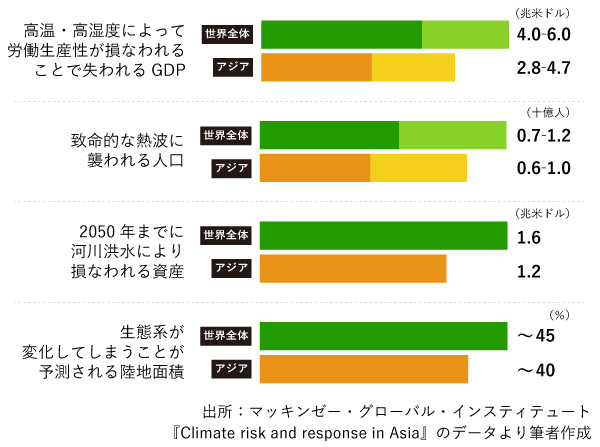 äžççãªã³ã³ãµã«ãã£ã³ã°äŒç€Ÿã§ããç±³ãããã³ãŒãŒã»ã¢ã³ãã»ã«ã³ãããŒã®ã·ã³ã¯ã¿ã³ã¯éšéããããã³ãŒãŒã»ã°ããŒãã«ã»ã€ã³ã¹ãã£ãã¥ãŒããããæšå¹Ž11æã«çºè¡šãããClimate risk and response in Asia ïŒã¢ãžã¢ã«ãããæ°åãªã¹ã¯ãšå¯Ÿå¿ïŒããšããã¬ããŒãã§ã¯ããã®ãŸãŸå¯Ÿçããªããã«ããå Žåã2050幎æç¹ã§ã©ã®ãããªåœ±é¿ãåºãããã·ãã¥ã¬ãŒã·ã§ã³ããŠããŸããããã«ãããšãäžççã«èŠãŠã¢ãžã¢ã«ããã圱é¿ãå§åçã«å€§ãããšãããŸãã