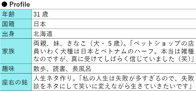 1989幎ãåæµ·éçãŸããåæµ·éæè²å€§åŠã忥åŸãæŽèåã¡ãŒã«ãŒã®ã±ã€ã·ã€ã·ã€ã«å ¥ç€Ÿã販売åºã®åºé·ãšããŠå€åããŠãã2015å¹Žãæ è¡ã§ãããã ã®ããã³ã蚪ãç§»äœã決æã飲é£ã³ã³ãµã«ã¿ã³ããšããŠããã€ã§ã®ã«ãã§ç«ã¡äžãäºæ¥ã«åå åŸã17幎12æã«ãªãŒã¬ããã¯ã³ã¹ã¡è²©å£²åºãtaran.ïŒã¿ã©ã³ïŒããããã³ã§éæ¥ã19幎11æã«ã¯èååºãHenriïŒã¢ã³ãªãŒïŒãããªãŒãã³ãæ°åã³ãããŠã€ã«ã¹ã®åœ±é¿ã§äž¡åºãäŒæ¥åŸã21å¹ŽïŒæã«taran.ããã€ã¢ã³ã«ç§»è»¢ãããªãã¥ãŒã¢ã«ãªãŒãã³ãåŠçæä»£ã¯ãã¹ã±ããããŒã«äžçãäœè²äŒç³»ãããçœãããªäººæã§ãç¬é¡ããã£ãŒã ãã€ã³ããïŒåçã¯Danang RyokoããæäŸïŒ