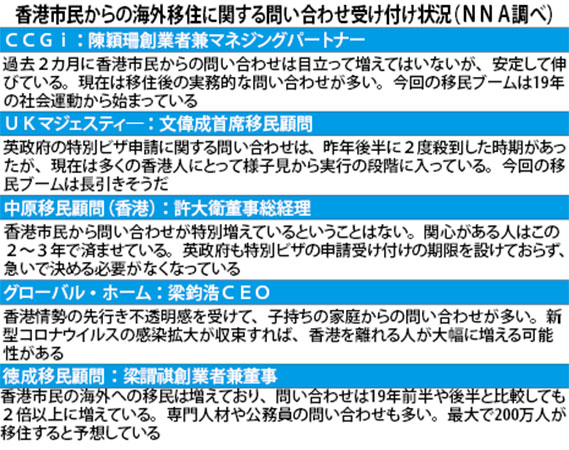 若い移住者が増えた背景については、英国やカナダが国安法の施行などに伴う香港市民への支援策として移住受け入れを拡大していると指摘。会員制交流サイト(SNS)で移民に関する情報が増え、不安感が減ったことも行動を後押しすると見る。