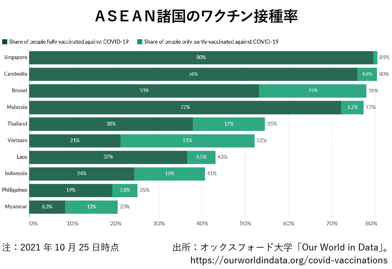 下記は英国オックスフォード大学が運営するウェブサイト「Our World in Data」がまとめている情報で、東南アジア諸国連合(ASEAN)各国におけるワクチン接種率を表したグラフになります。シンガポール、カンボジア、マレーシアは人口の半数以上が2回接種を終えている一方、ベトナム、インドネシア、フィリピン、ミャンマーなどは非常に低い数字にとどまっています。