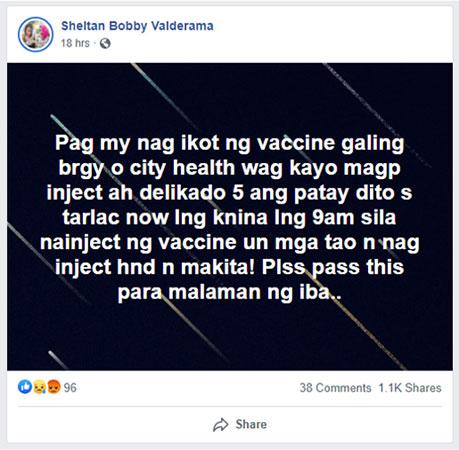 これはフェイスブック及びツイッターで拡散されたものですが、フィリピン保健省とタルラック市当局が明確に「虚偽」であると否定しました。