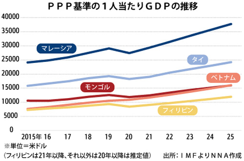 国際通貨基金(IMF)の統計によると、19年のモンゴルの購買力平価(PPP)基準の1人当たりGDPは1万2,558米ドル(約138万5,400円)で、ベトナム(1万535米ドル)やインドネシア(1万2,483米ドル)をも上回る。25年には1万6,000米ドルに迫る見通しだ。