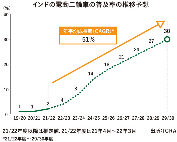 同社は、新車販売に占める電動二輪車の割合は24/25年度までに13~15%(台数換算250万~300万台)、29/30年度までに30%(同750万~800万台)に達すると予測。ゴスワミ氏は「22~30年の間に、年平均成長率50%超で伸びる」と成長のスピードを強調した。