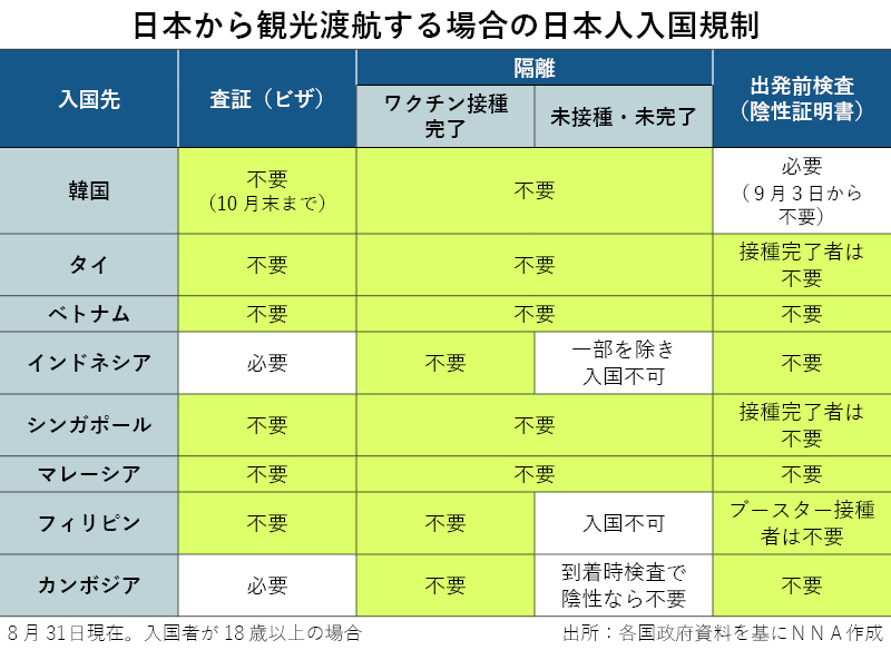 日本での海外旅行商品の販売に目を向けると、旅行大手エイチ・アイ・エス(HIS)では今年5月から海外パッケージツアーの販売を再開。アジア圏では6月に再開したタイのバンコクを皮切りに、8月末までにベトナム、マレーシア、韓国などのツアーが再開している。「旅行先として、入国条件が緩和されている国・地域が選ばれている」とは広報の宇佐美加奈さん。