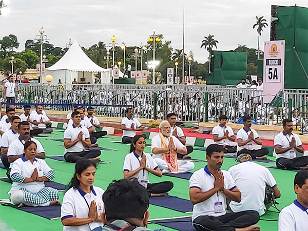 「国際ヨガの日」に開催された大規模ヨガイベントに、インドのモディ首相(写真中央)も参加した=6月21日、カルナタカ州マイソール(NNA撮影)