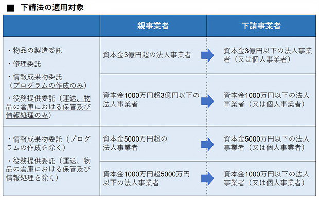 以äžã®ããã«ãé©çšå¯Ÿè±¡ãšãªãååŒã¯å€å²ã«ããããŸããä»ã®äºæ¥è ã«æ¥åãå§èšããå Žåã¯ãäžè«æ³ã®é©çšå¯Ÿè±¡ãšãªãååŒå 容ã«è©²åœããªããã確èªãããšè¯ãã§ãããã