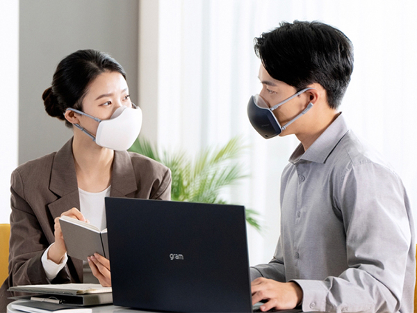 「LGピュリケアマスク」は、マスク内側の左右2カ所に高性能フィルターを用いた超小型ファンを設置。内蔵センサーが吸気と呼気の圧力を感知し、マスクに流入する空気量をファンが調節する仕組みだ。試験機関の実験では0.01マイクロメートルの粒子を99.999%除去したという。