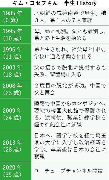 1985年、北朝鮮の咸鏡南道生まれ。食糧不足のため10歳で母と姉を失い、父や弟とも離別。23歳で脱北に成功し韓国籍を獲得。28歳で日本に語学留学し、大学進学を経て就職。2020年、ユーチューブチャンネル「脱北者が語る北朝鮮」開設。自伝『僕は「脱北YouTuber」』を22年に出版。大阪府在住(本人提供)