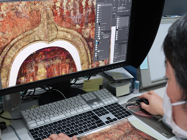 色だけでなく、壁画表面の質感や形状を忠実に再現するには、細部の三次元(3D)計測も必要だ。コロナ下の移動規制が残る中、タイ人の担当者には何度も首都バンコクからアユタヤに足を運んでもらった。そろったデータを図面に落とし込んだ最終的な試作品を、水際対策が解除された21年にようやく現地に持ち込むことができたという。