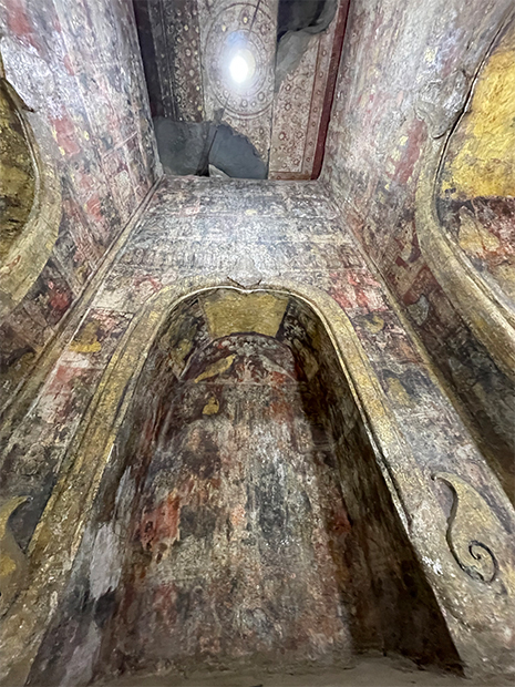 ワット・チャヤブラナ地下聖堂で修復中の壁画。白く色があせ、仏像や模様の輪郭も見えづらくなっている=9月、アユタヤ(大塚オーミ陶業提供)