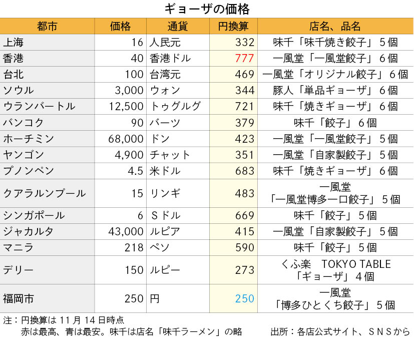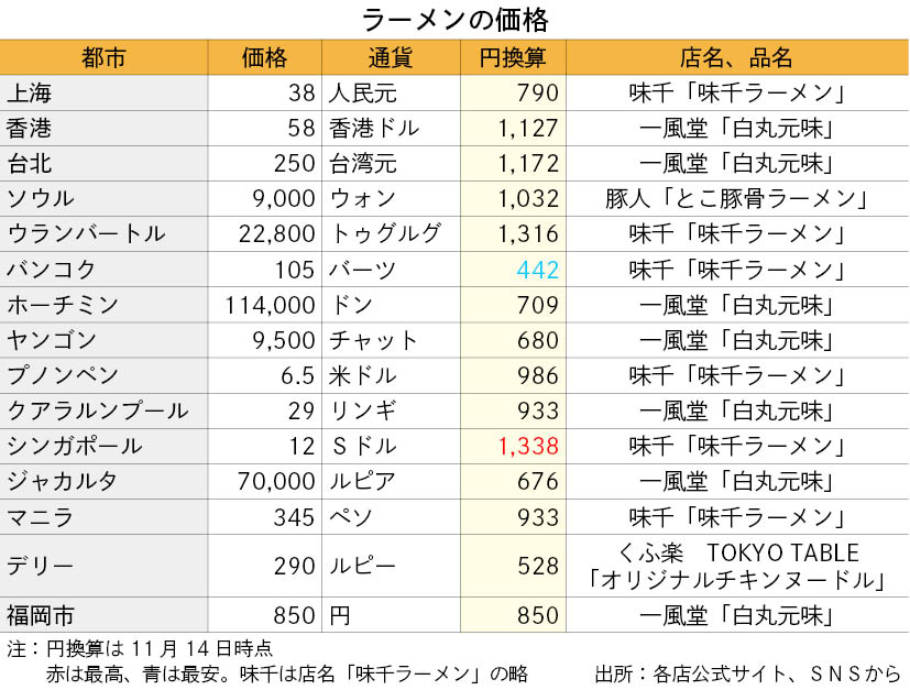 アジア各地で物価の上昇が止まらない。安いアジアも今や昔、円安相場のリアルを直視しよう。駐在暮らしや長い出張で恋しくなる日本の味、ラーメンの「いま」の価格をアジア15都市で調べた。