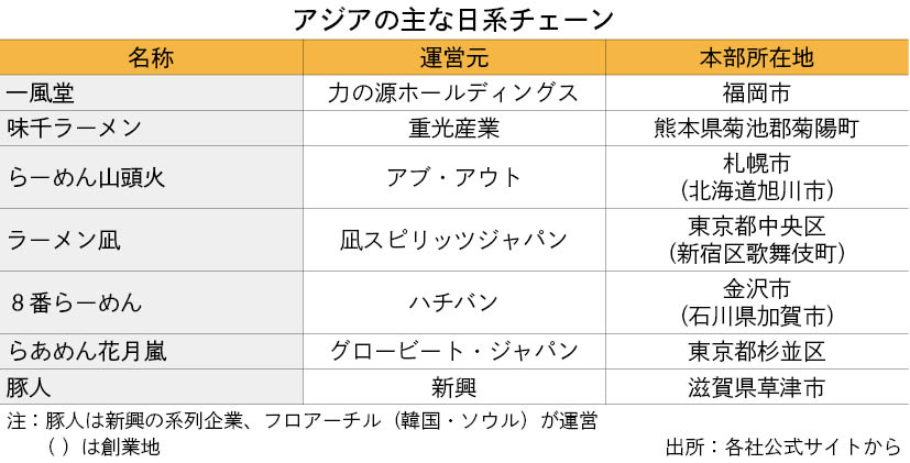 価格表には入らなかったが、調査の候補に挙がったチェーンは他にも、旭川ラーメンの「らーめん山頭火」、東京・新宿発祥の煮干しラーメン「ラーメン凪(なぎ)」、石川県生まれの「8番らーめん」、グロービート・ジャパン(らぁめん花月嵐、ちゃぶ屋とんこつらぁ麺CHABUTONを運営)などがあった。アジアでは3~6カ国・地域にそれぞれ進出しており、さらなる展開が期待される。