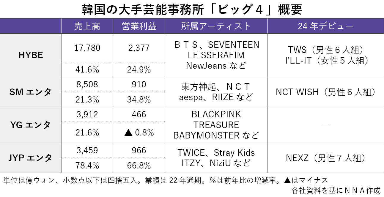 成長を続けるK-POP市場をけん引するのは、芸能事務所HYBE(ハイブ)、SMエンタテインメント、YGエンターテインメント、JYPエンターテインメントの大手4社。「ビッグ4」とも呼ばれ、資金力と企画力をバックに業績を順調に伸ばしている。24年も新人グループのローンチが複数発表されており、好調は続く見通しだ。ハイハットはこの「ビッグ4」と肩を並べることを目標に掲げる。