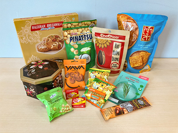 アジア各地の土産品。鮮やかなパッケージが印象的(NNA撮影)